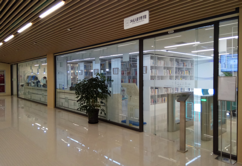 24小时无人值守图书馆位于医科馆B1层,该区域共收藏了6000多册社科人文类和医学科技类图书。读者须刷读者证(一卡通或借书证)才能进入和离开阅览区。阅览区设有15个阅览座位,1台自助借还机,为读者提供24小时的全天候图书借阅服务。阅览区还配备24小时设备动态和图像监控,自动检测图书记录信息。书架照明采用感应灯,环保节能。